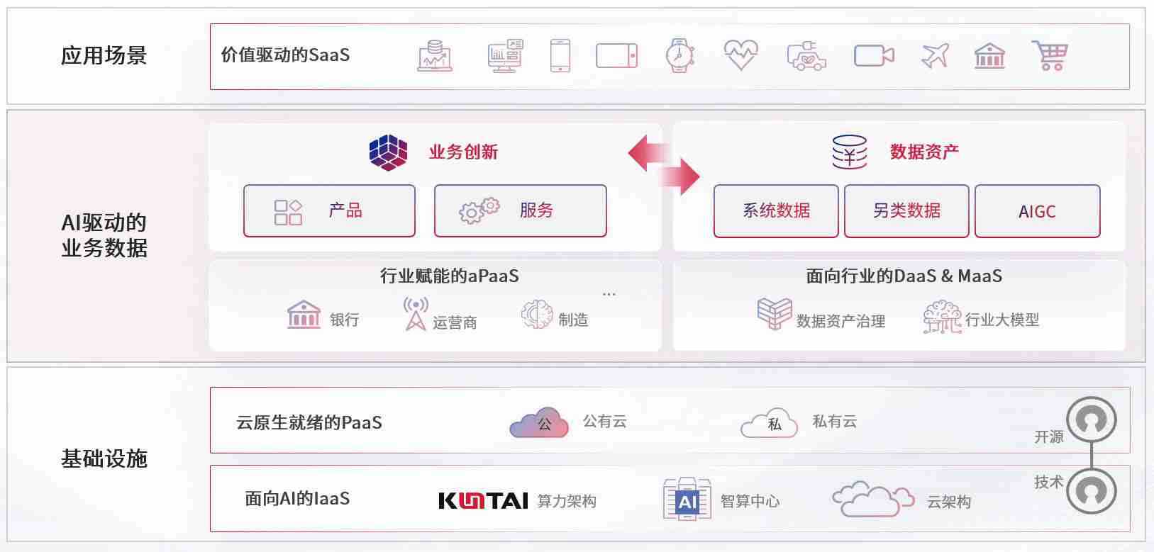 数字时代,,围绕企业数字化转型的关键要素,,77779193永利官网数码开创性的提出数云融合战略和技术体系框架,,,着力在云原生、、、数字原生、、AI原生和信创产业上架构产品和服务能力,,为处在不同数字化转型阶段的快消零售、、、汽车、、、、金融、、医疗、、政企、、教育、、运营商等行业客户提供泛在的敏捷IT能力和融合的数据驱动能力,,,,构建跨界融合创新的数字业务场景和新业务模式,,,,助力企业级客户建立面向未来的核心能力和竞争优势,,,,全面推动社会的数字化、、、、智能化转型升级。。。。